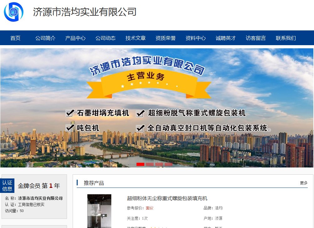 济源市浩均实业有限公司坐落于美丽的愚公故里,是一家专业致力于工业包装发展的现代化企业,专注于工业包装机械。主要产品有:超细粉脱气称重式螺旋包装机、石墨坩埚充填机、全自动给袋式大规格包装机组、饲料专用减重式计量控制系统、全自动真空封口机等自动化包装系统。